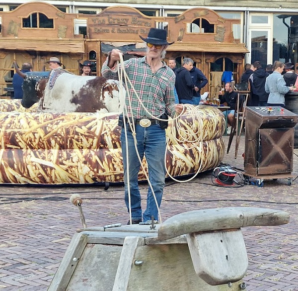 ![]() ![]() Klik op bovenstaande foto voor meer informatie of ons westerndorpje Hierboven ziet u beide rodeostieren op het Pretfestival |