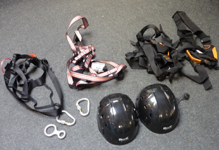 speciaal klimtuigje en een touw om te zekeren, zodat de