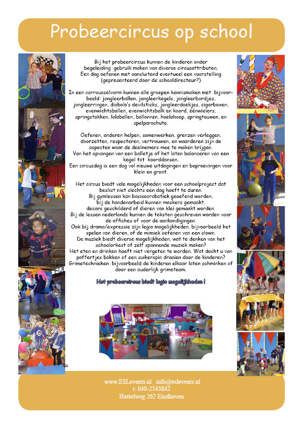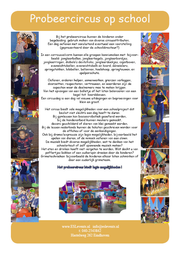 winkelcentra Bij het kinderprobeercircus kunnen de kinderen onder begeleiding van twee personen gebruik maken van diverse circusattributen. In een soort "workshops" proberen ze als echte artiesten op een éénwieler fietsen, Chinese bordjes te draaien op een stok, op een evenwichtsbal lopen en jongleren met kegels, balletjes en cigarboxen. De kinderen kunnen vrijblijvend kennismaken en spelen met diverse kinderattributen. Natuurlijk zijn met dit thema leuke uitbreidingen mogelijk zoals clown jongleurs en bijvoorbeeld steltlopers