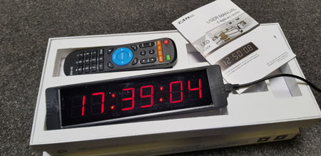 Op en aftelklok met spreektijd instelmogelijkheid Interval en stopwatchfunctie ( voor bijvoorbeeld trainingsdoeleinden) incl normale 24 uurs klok functie AFM 21x5cm 3 functies:incl afstandbed. Werkt op 230 Volt