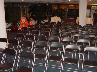 presentatie Behalve het podium geluid etc. kunnen we voor u ook de stoelen plaatsen en snel weer opruimen zodat de ruimte eventueel weer snel beschikbaar komt voor de borrel De stoelen zijn verpakt per 12 in een stapelbare kist