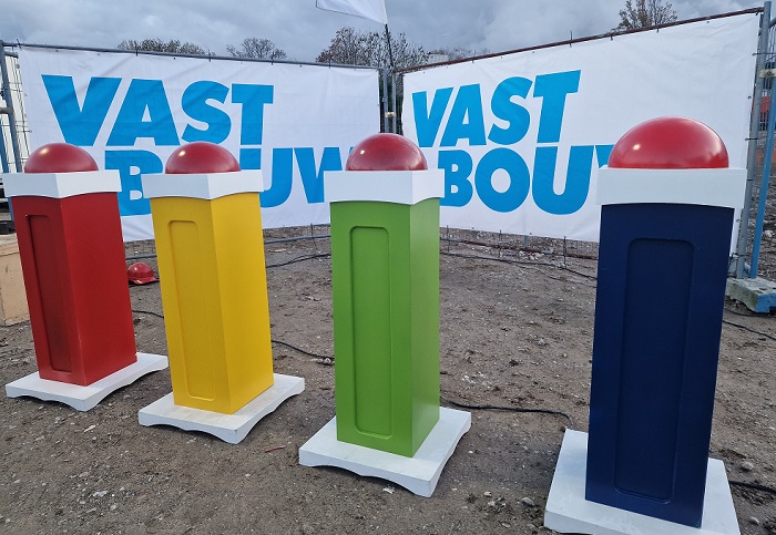 ![]() Bouwhandeling met twee grote houten hamers in de huiskleuren met als centrale punt de eerste piket als symbool voor de officiële start van de bouw Klik op de foto voor meer info |